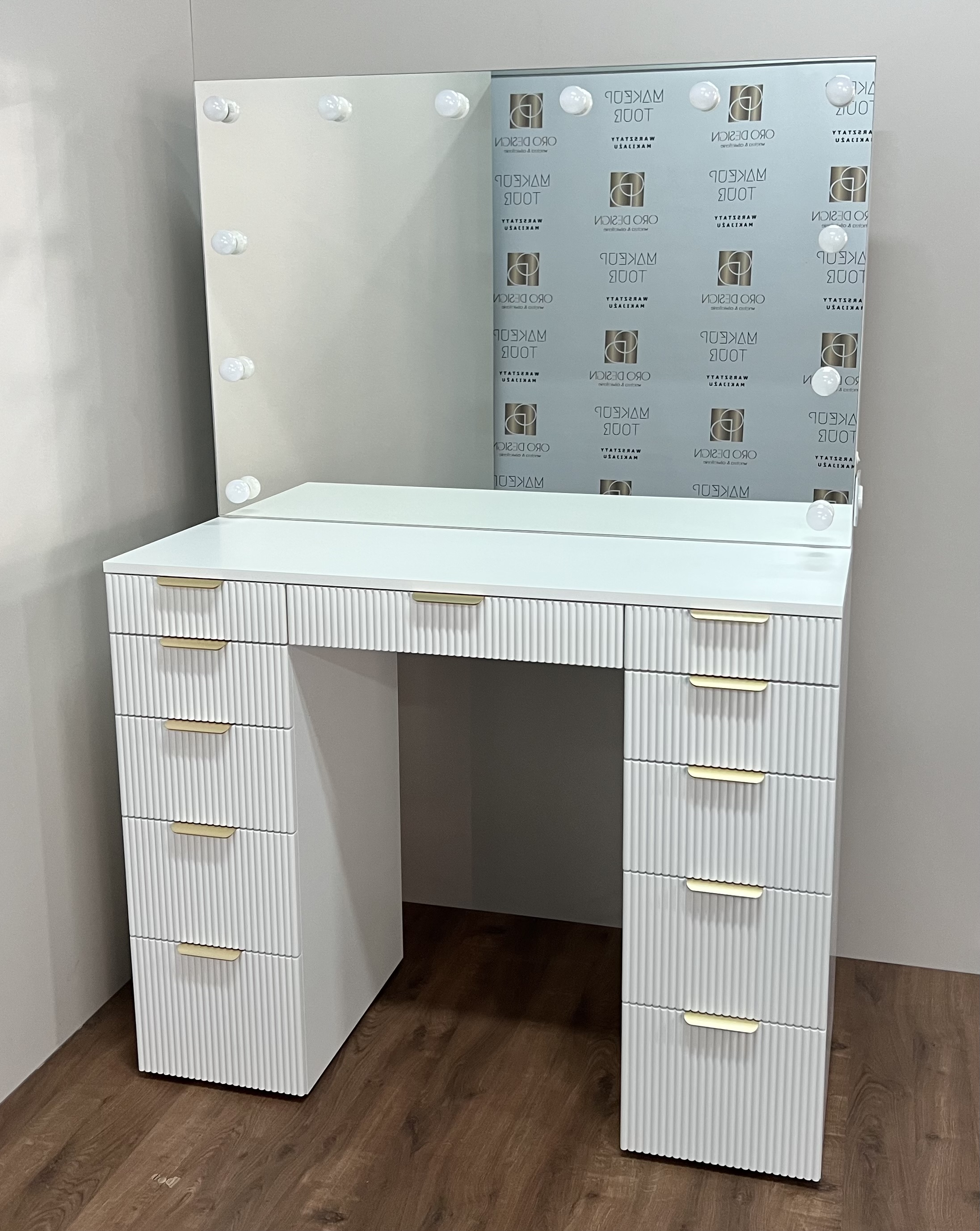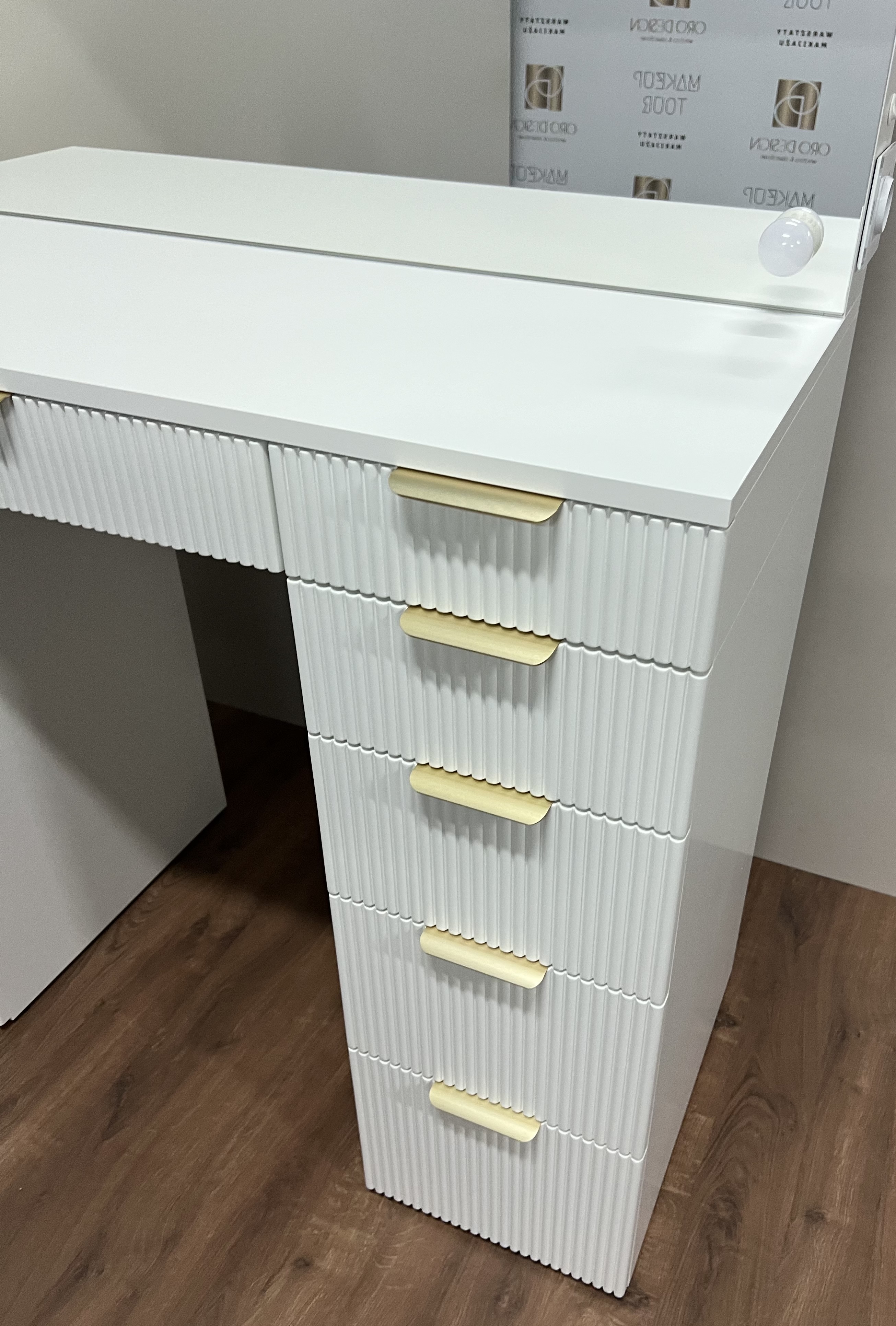 Stanowisko do wizażu to samodzielny mebel, składający się z lustra do wizażu i toaletki do wizażu. Dzięki zastosowaniu bardzo prostego systemu łączenia lustra z blatem toaletki, całość jest stabilna a stanowisko może stanąć w każdym miejscu.